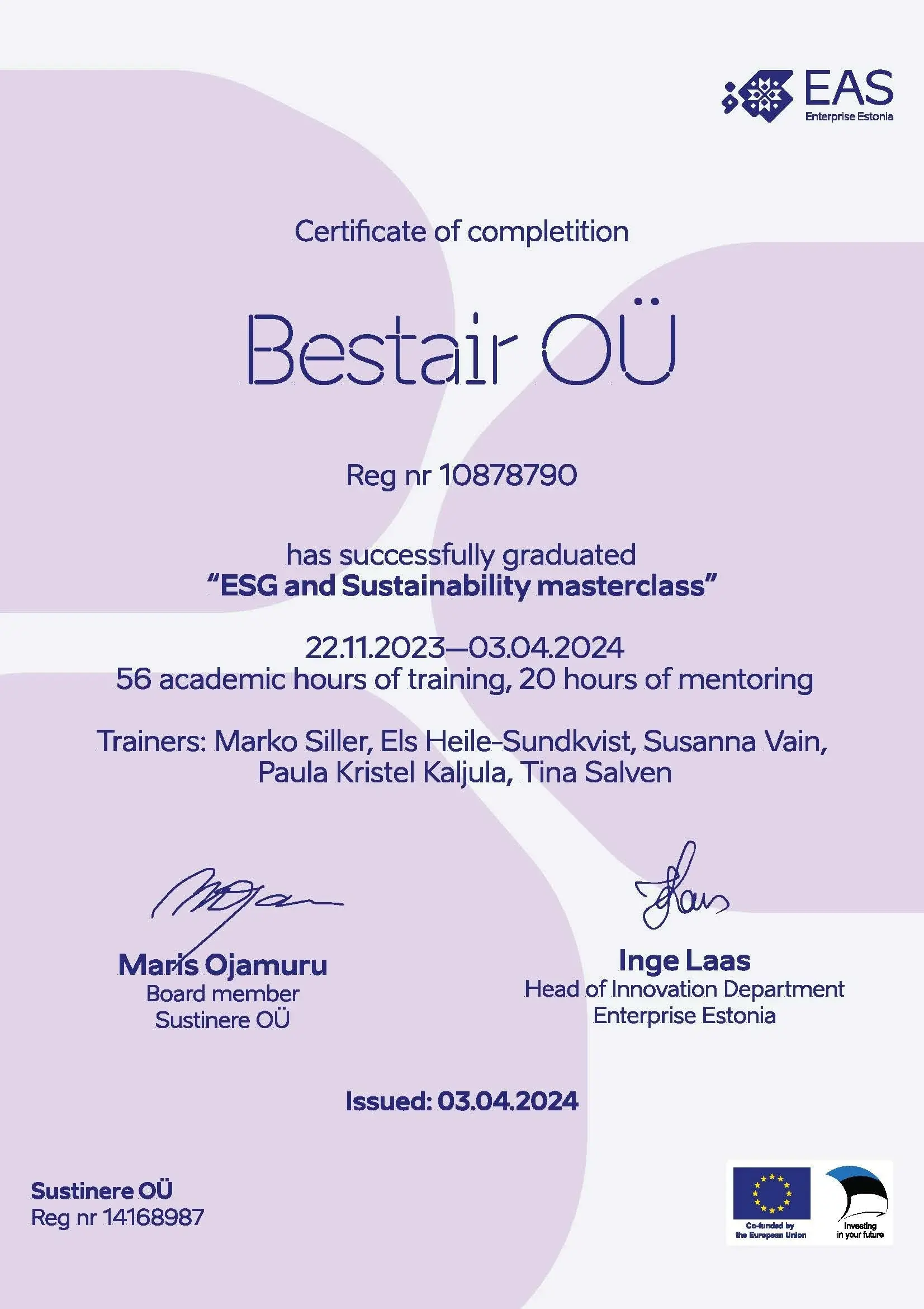 Meie ettevõtte ESG ja jätkusuutlikkuse visioon ja ambitsioonid on kooskõlas Bestair Groupi äsja uuendatud missiooni ja visiooniga. See väljendab selgelt meie eesmärki olla juhtiv jõud keskkonnavastutuse ja sotsiaalse jätkusuutlikkuse valdkonnas meie tööstusharus.